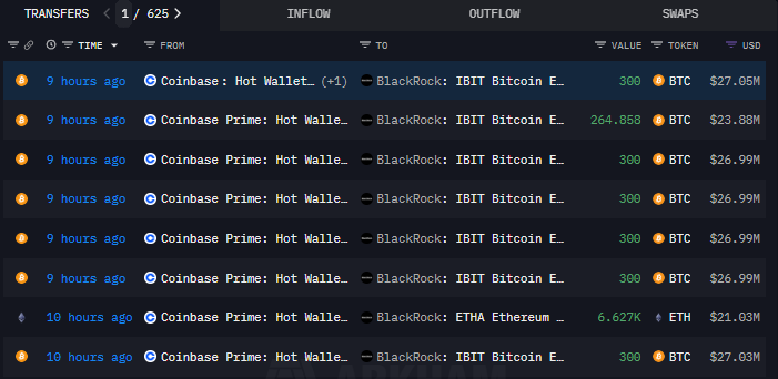 Cụ thể, quỹ ETF Bitcoin IBIT của BlackRock đã rút tổng cộng khoảng 2.064.858 BTC từ địa chỉ ví nóng Coinbase Prime, trị giá khoảng 185,92 triệu đô la; ngoài ra, quỹ ETF Ethereum EHTA của BlackRock đã rút 6.627 ETH, trị giá khoảng 21,03 triệu đô la.