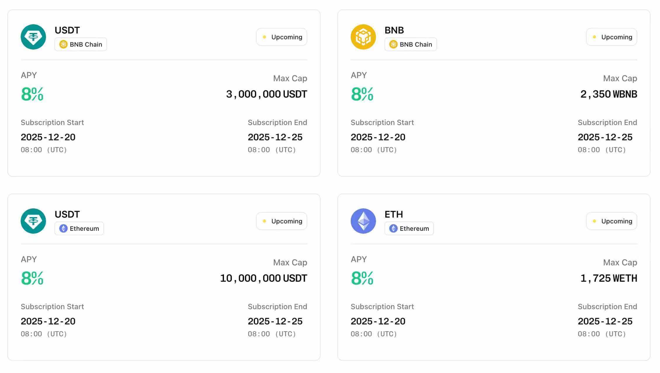 Trang Odaily Planet Daily đưa tin Buidlpad đã thông báo ra mắt sản phẩm tiền gửi có kỳ hạn DeFi, Buidlpad Vault, với lãi suất cố định 8%. Các khoản tiền gửi đầu tiên sẽ được mở vào lúc 8:00 AM UTC ngày 20 tháng 12, hỗ trợ ETH và USDT trên Ethereum và BNB và USDT trên BSC. Tiền gửi sẽ được mở khóa vào ngày 25 tháng 1 năm 2026.