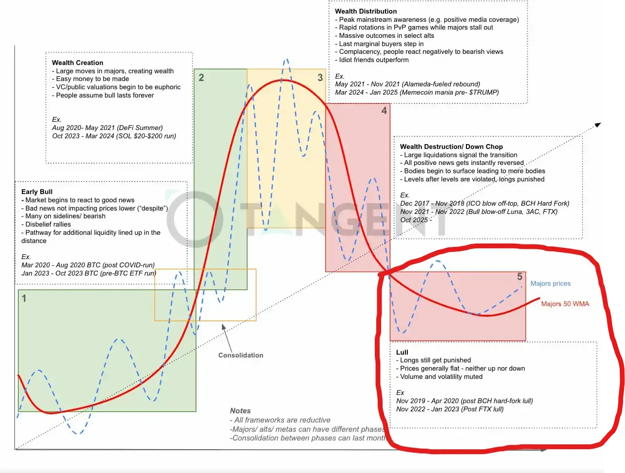 Tuy nhiên, các loại tiền điện tử chính thống vẫn đang ở giai đoạn 4 — sự sụp đổ của DAT vẫn chưa thực sự xảy ra. Do đó, cách tiếp cận hiện tại là theo dõi thị trường với tâm lý "sẵn sàng mua", thay vì chờ đợi sự phục hồi để bán khống.