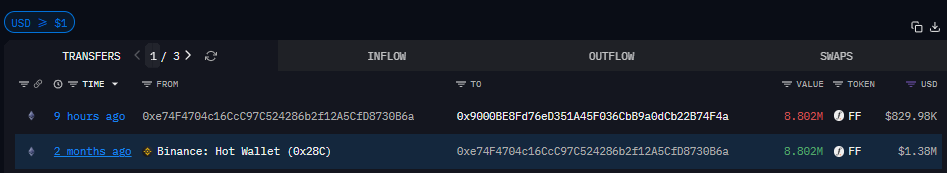 Một nhà đầu tư lớn đã gửi 8,802 triệu token FF vào Binance; việc bán chúng sẽ dẫn đến khoản lỗ khoảng 550.000 đô la.