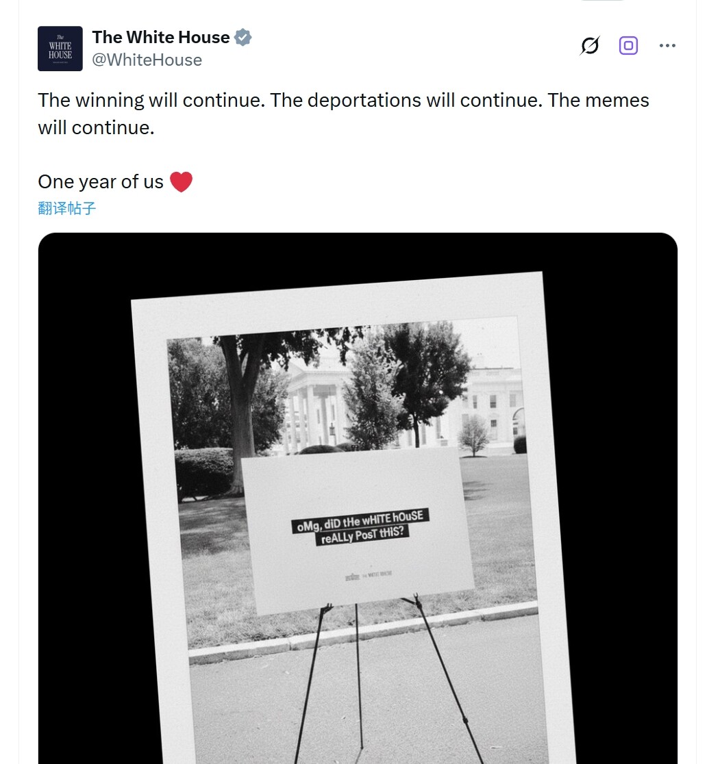 Odaily星球日报讯 白宫官方账号在X平台发文表示,胜利、驱逐行动以及meme都将持续出现。
