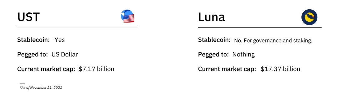 Terra sử dụng mô hình mã thông báo kép: TerraUSD (stablecoin thuật toán, còn được gọi là UST) và Luna (quản trị, mã thông báo cam kết).