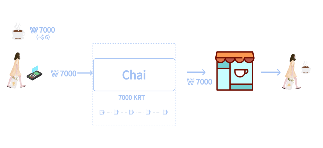 Một người tiêu dùng ở Seoul trả ₩7.000 cho một tách cà phê chọn thanh toán qua CHAI và khoản thanh toán bằng won chảy ra khỏi tài khoản ngân hàng của cô ấy trở thành 7.000 KRT (stablecoin được chốt bằng won của Terra) trong hệ thống xử lý của CHAI), thông qua chuỗi khối , KRT cuối cùng được chuyển liền mạch cho các thương nhân dưới dạng đồng won Hàn Quốc. Cả người tiêu dùng và người bán đều không cần biết rằng khoản thanh toán được chuyển thành stablecoin trong thời gian ngắn. Đồng thời, Luna trị giá ₩7.000 bị phá hủy, nguồn cung Luna trên thị trường giảm và tài sản do Lunatics nắm giữ trở nên có giá trị hơn.
