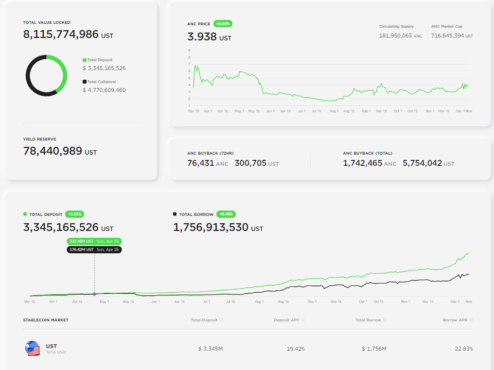 Anchor sẽ được ra mắt vào tháng 3 năm 2021. Điểm nổi bật nhất của nó là cung cấp tỷ lệ tiết kiệm hàng năm ổn định khoảng 20%. Có lẽ tỷ lệ hoàn vốn 20% thường hấp dẫn đối với người dùng tiền điện tử đã trải qua thời kỳ bùng nổ khai thác DeFi, nhưng đối với người dùng trong thế giới tài chính truyền thống, 20% là khá hấp dẫn, vì vậy Anchor thu hút một lượng lớn người dùng và tiền cho Terra.