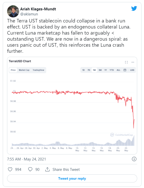 Khi các nhà đầu tư mất niềm tin vào Luna, nhu cầu thị trường đối với UST bắt đầu giảm. Theo cơ chế tiền tệ của Terra, giá của UST giảm xuống dưới mức cố định $1 và những người nắm giữ UST đã đổi UST của họ lấy Luna. Kết quả là, khi thị trường có nhu cầu về Luna cạn kiệt, nguồn cung của Luna lại tăng lên và lạm phát của Luna khiến giá của nó giảm sâu hơn, làm trầm trọng thêm vòng luẩn quẩn.Rủi ro này, thường được gọi là