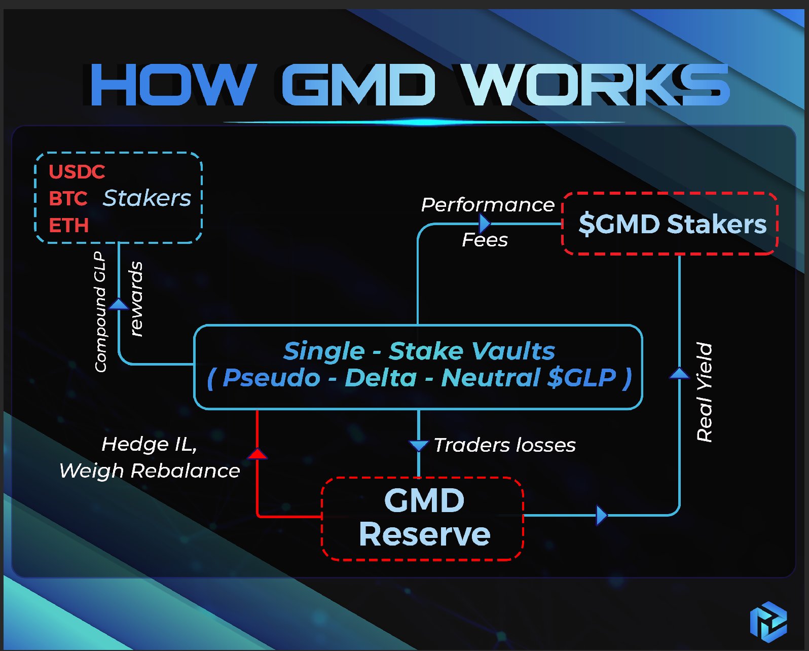 Tóm tắt mô hình trong một câu: Tăng BTC/ETH/USDC theo tỷ lệ và gửi chúng vào GLP, sau đó tự bảo vệ PnL của Nhà giao dịch