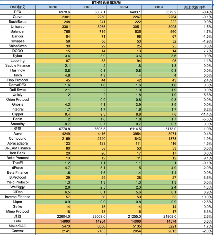 Tuần này, TVL đã giảm tổng cộng 0,9 tỷ bảng, giảm ~2%. TVL tiếp tục xu hướng giảm trong những tuần gần đây, với mức giảm tích lũy hơn 10%. Tỷ trọng của chuỗi ETH không thay đổi nhiều trong tuần này và có xu hướng giảm nhẹ. Ngoại trừ chuỗi cơ sở tăng 95% và chuỗi BSC tăng 2%, tất cả các chuỗi công cộng phổ biến về cơ bản đều đang giảm. Điều đáng chú ý là tốc độ tăng trưởng của chuỗi Base đã tăng vọt trong tuần này sau khi chững lại vào tuần trước .
