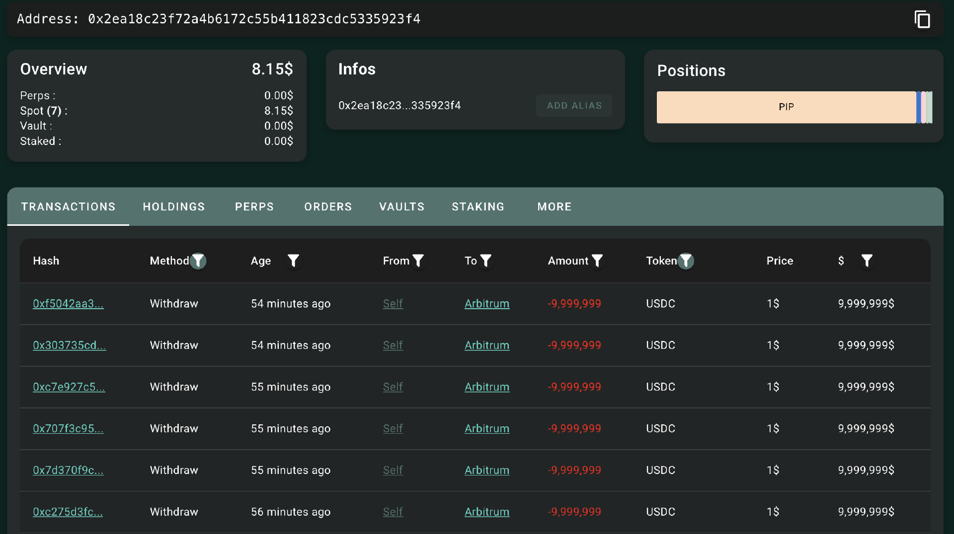 Để đưa ra một ví dụ đơn giản, dữ liệu Hypurrsan cho thấy địa chỉ cá voi bắt đầu bằng 0x2ea18 đã kiếm được 72,33 triệu đô la Mỹ bằng cách bán khống BTC và ETH trong 24 giờ qua. Cá voi này đã rút 60 triệu đô la Mỹ bằng USDC sang Arbitrum và bảo toàn lợi nhuận.