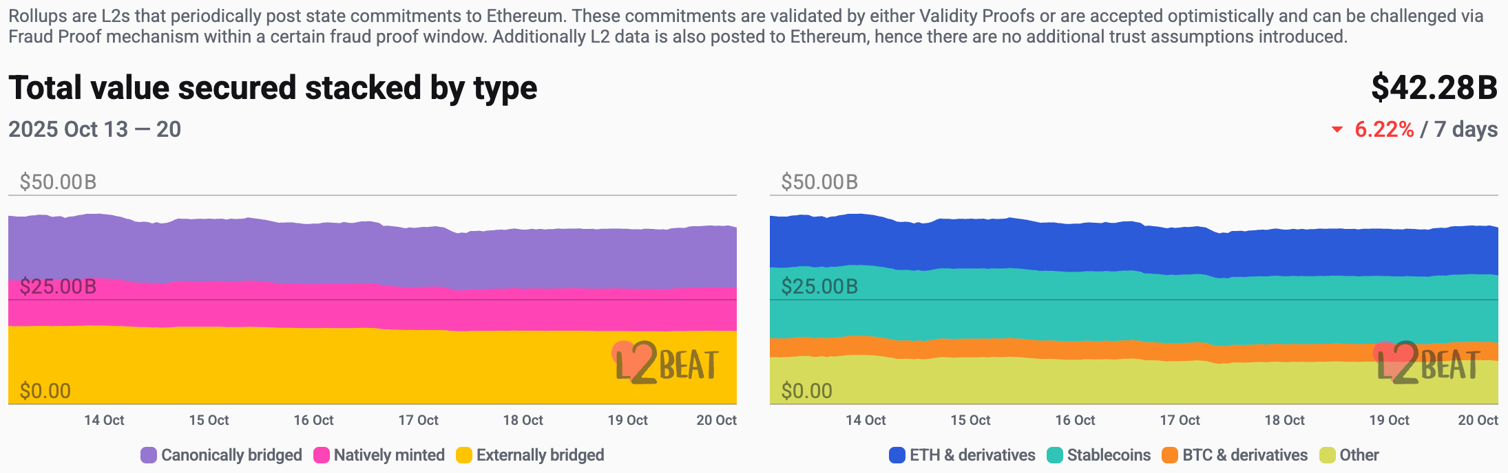 Theo dữ liệu của L2Beat, tổng TVL của Ethereum Layer 2 là 42,28 tỷ đô la Mỹ, giảm 6% trong tuần này so với tuần trước (44,98 tỷ đô la Mỹ).