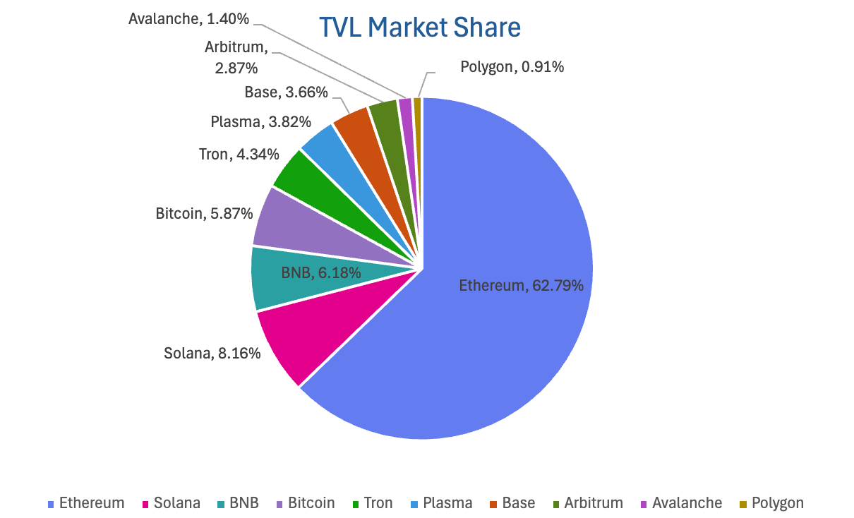 Chia theo chuỗi công khai, ba chuỗi công khai có TVL cao nhất là Ethereum Chain, chiếm 62,79%; Solana Chain, chiếm 8,16%; và BNB Chain, chiếm 6,18%.
