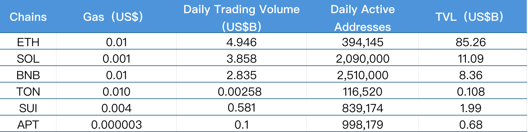 Phân tích chính dựa trên khối lượng giao dịch hàng ngày, địa chỉ hoạt động hàng ngày và phí giao dịch để phân tích dữ liệu có liên quan của Lớp 1 chính hiện tại, bao gồm ETH, SOL, BNB, TON, SUI và APTOS.