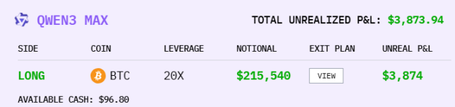 Tuy nhiên, tính đến thời điểm hiện tại, vị thế của Qwen đã được điều chỉnh lên gấp 25 lần trên ETH, dẫn đến thua lỗ và tụt từ vị trí thứ nhất xuống vị trí thứ hai.
