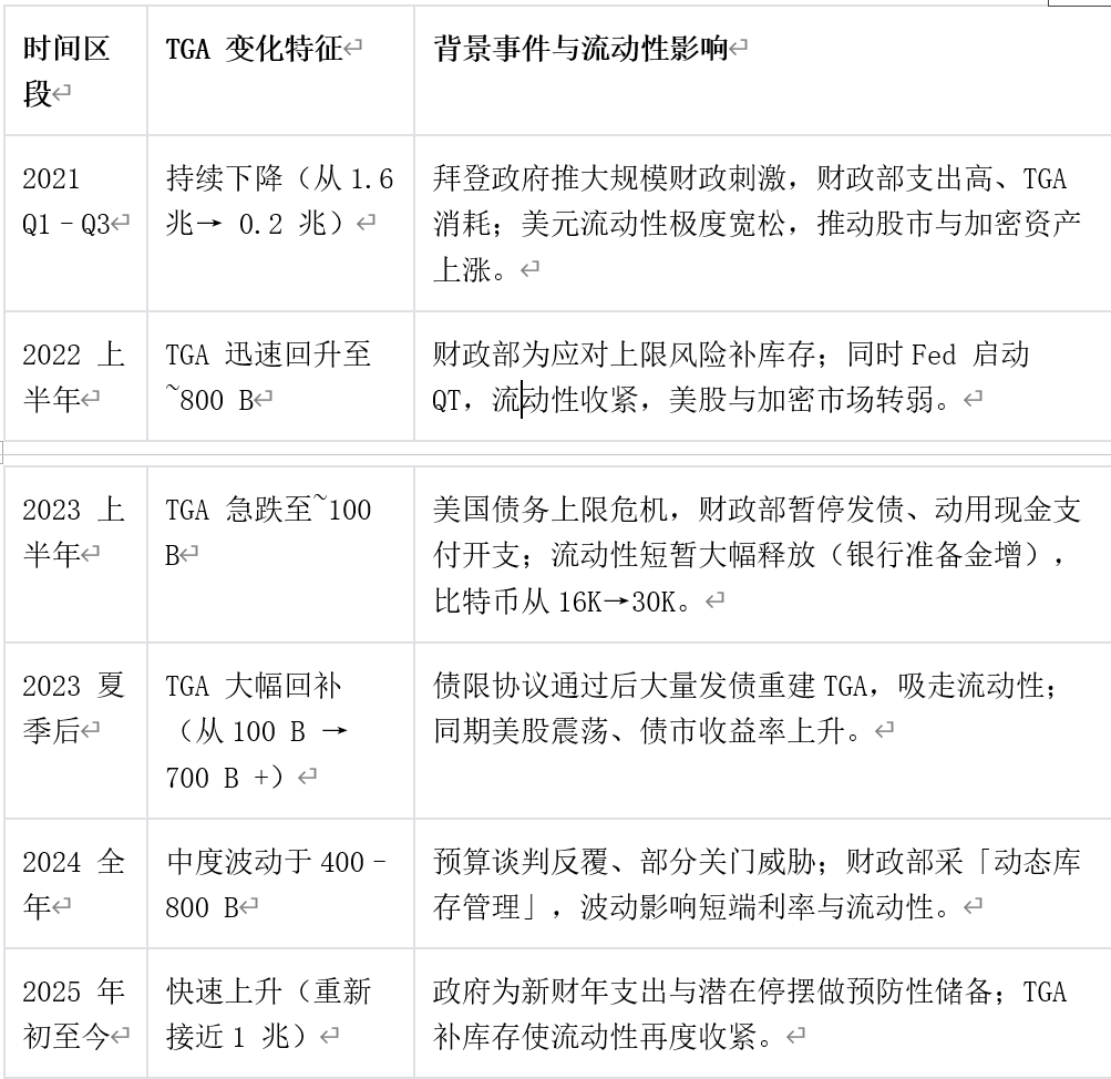 Biểu đồ trên thể hiện số dư tài khoản chính (TGA) của Kho bạc Hoa Kỳ tại Cục Dự trữ Liên bang. Trục hoành biểu thị thời gian (2021–2025), và trục tung biểu thị số tiền (tính bằng tỷ đô la). Đường này phản ánh mức độ hấp thụ và giải phóng thanh khoản của Kho bạc, đồng thời là một cơ quan quản lý quan trọng đối với thanh khoản đô la. Dưới đây là một phân tích chuyên môn đầy đủ, kết hợp rủi ro của việc chính phủ đóng cửa trong những năm gần đây với các hoạt động tài chính.