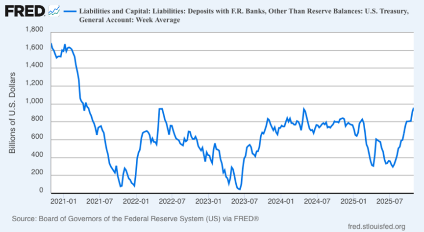 Trong thời gian đóng cửa, một số khoản thanh toán của chính phủ đã bị tạm dừng, và mức TGA vẫn giữ nguyên hoặc giảm nhẹ trong ngắn hạn. Tuy nhiên, do thiếu nguồn cung trái phiếu chính phủ mới trên thị trường, nhu cầu từ các quỹ thị trường tiền tệ đã tăng vọt lên mức ON RRP.