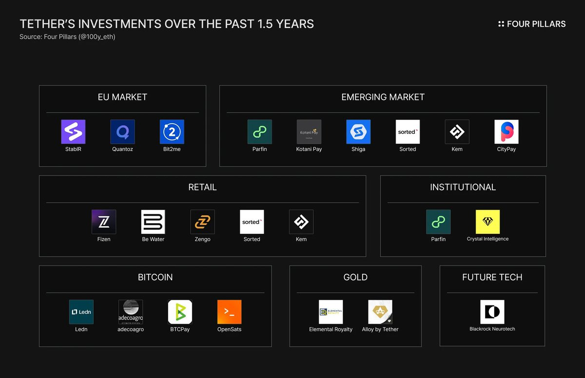 Tether rất tích cực đầu tư vào các công ty, nhưng hầu hết các công ty trong danh mục đầu tư của họ đều không phát hành token hoặc có đặc điểm khu vực đáng kể, do đó các khoản đầu tư này chưa thu hút được sự chú ý rộng rãi trong cộng đồng tiền điện tử. Tuy nhiên, việc xem xét danh mục đầu tư của Tether vẫn có thể hé lộ những manh mối về định hướng tương lai của công ty.