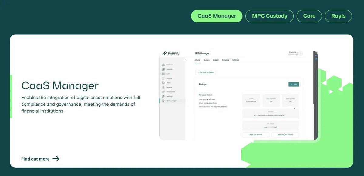 Parfin là một công ty cơ sở hạ tầng blockchain cho tổ chức có trụ sở chính tại Mỹ Latinh. Parfin cung cấp các nền tảng quản lý và quy trình làm việc cho phép các tổ chức tài chính dễ dàng áp dụng công nghệ blockchain và tiền điện tử, đồng thời cung cấp các giải pháp ví MPC (Tính toán Đa bên) an toàn và dịch vụ mã hóa tài sản.