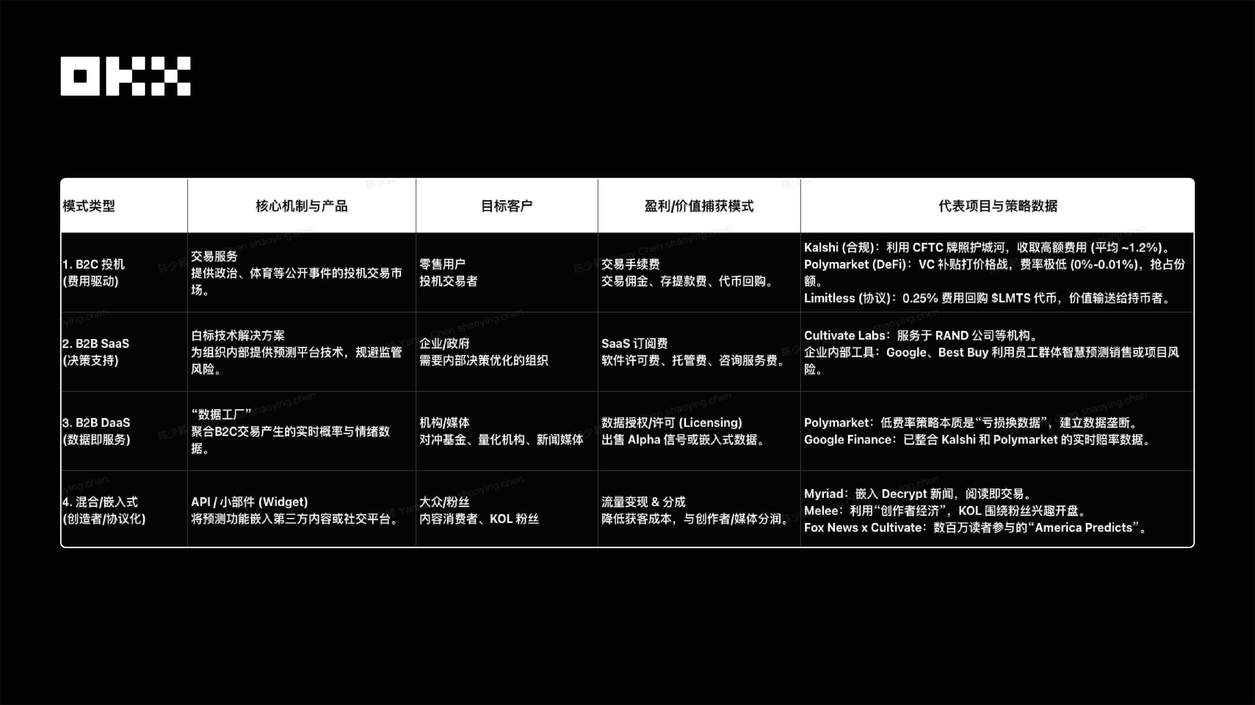 Thị trường dự đoán đang phát triển từ việc chỉ kiếm tiền từ phí giao dịch B2C sang mô hình DaaS B2B khai thác giá trị dữ liệu và cuối cùng sẽ chuyển sang mô hình kết hợp được nhúng trong hệ sinh thái truyền thông và người sáng tạo để giảm thiểu chi phí thu hút khách hàng.