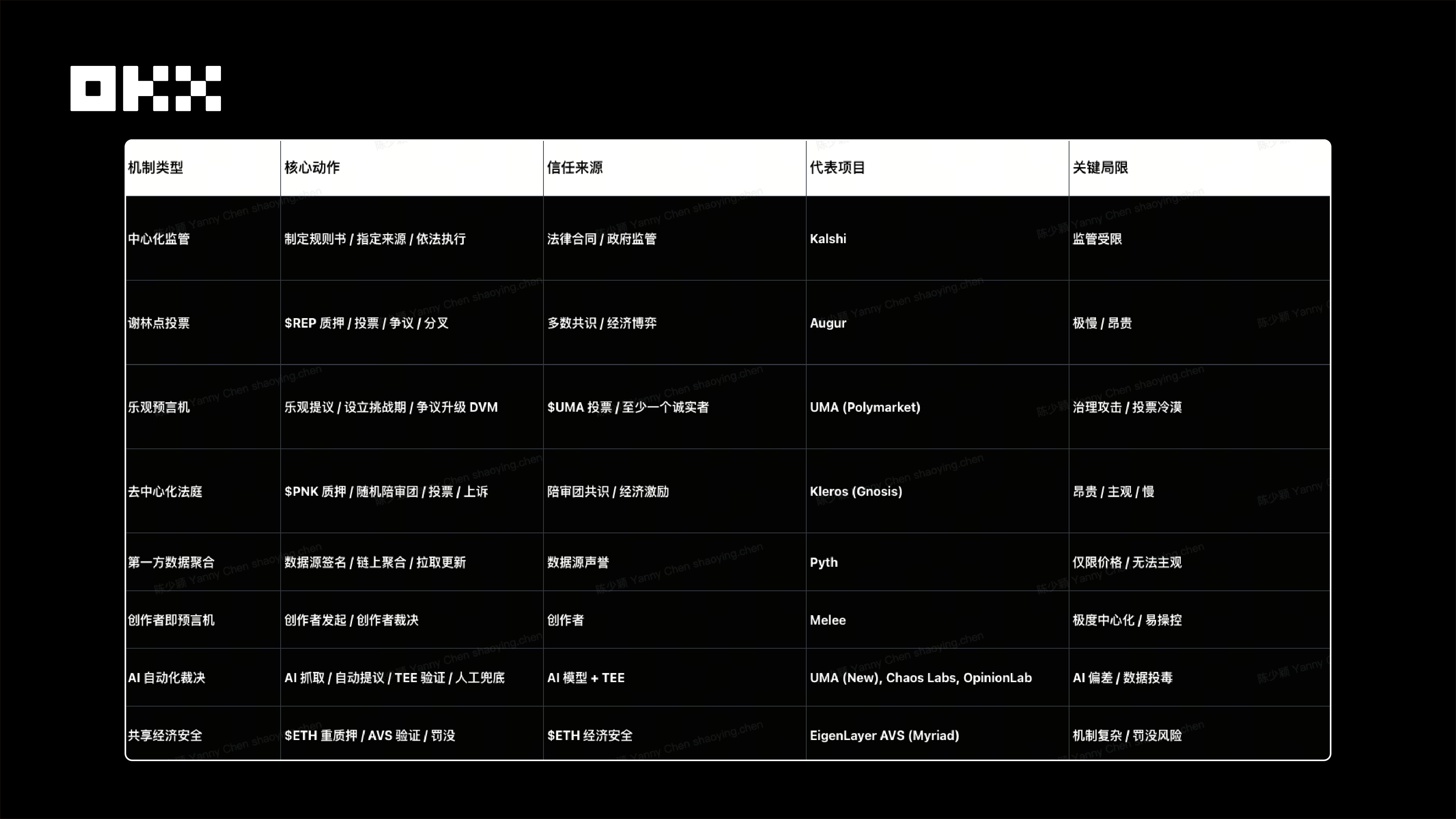 - UMA (Polymarket): Chế độ Oracle lạc quan. Được thông qua mặc định nếu không bị phản đối; nếu bị phản đối, nó sẽ chuyển sang bỏ phiếu DVM.
