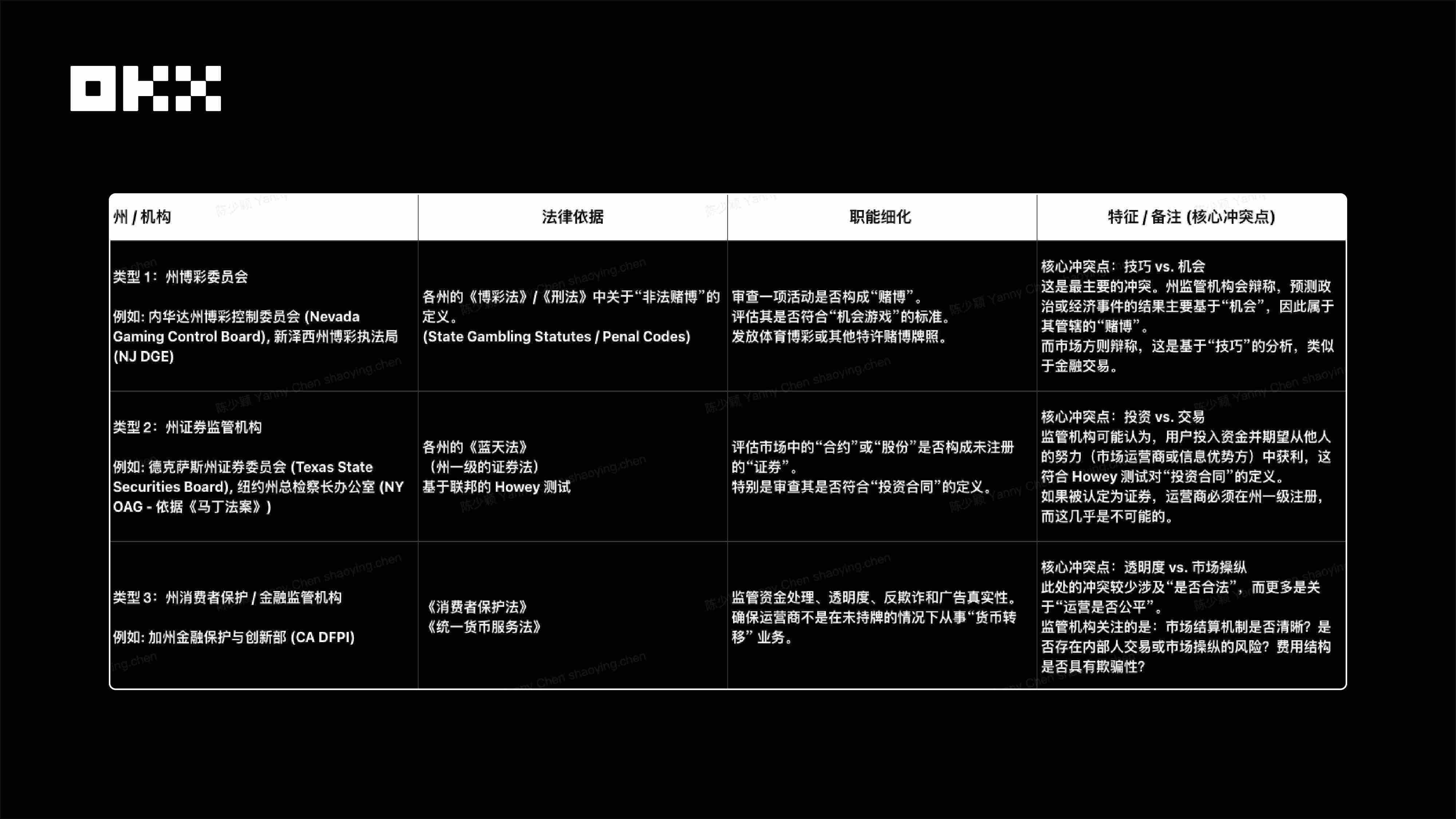 Nói một cách thẳng thắn, bối cảnh quản lý hiện tại cực kỳ hỗn loạn, và việc thống nhất gần như không thể trong ngắn hạn. Các phân loại khác nhau sẽ dẫn đến các yêu cầu tuân thủ và hậu quả pháp lý rất khác nhau. Thứ nhất, nếu được phân loại là hàng hóa hoặc sản phẩm phái sinh, cơ quan quản lý là Ủy ban Giao dịch Hàng hóa Tương lai (CFTC) cấp liên bang. Lý do là thị trường được sử dụng để phòng ngừa rủi ro từ các sự kiện trong tương lai (như lãi suất và các sự kiện chính trị), hoạt động tương tự như hợp đồng tương lai, phục vụ việc phát hiện giá và quản lý rủi ro. Nền tảng Kalshi đang nỗ lực phát triển theo hướng này và đã được CFTC cấp phép.