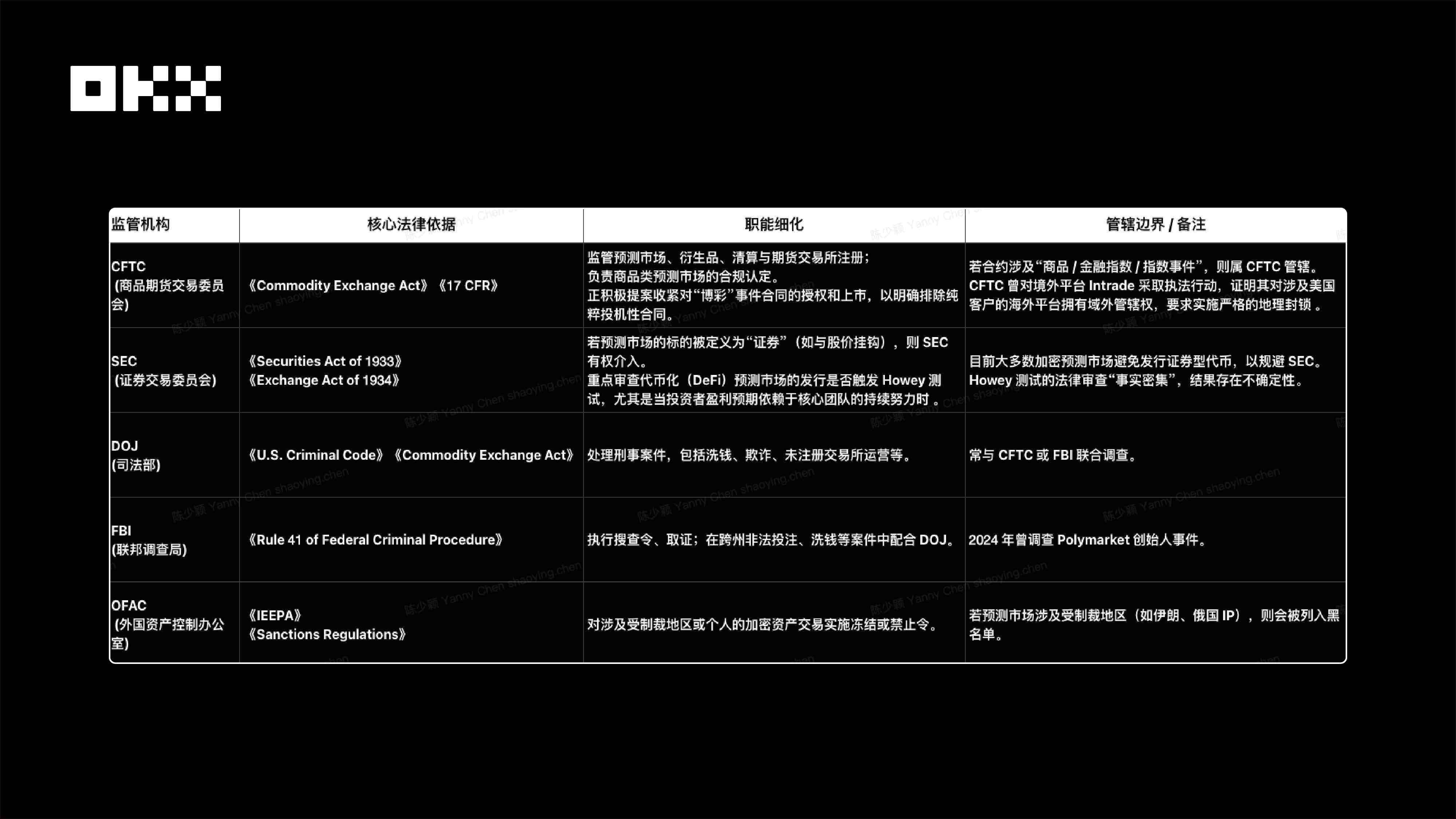 Cuối cùng, nếu được phân loại là chứng khoán, cơ quan quản lý là SEC (Ủy ban Chứng khoán và Giao dịch) cấp liên bang, chủ yếu nhắm vào các nền tảng DeFi. Khi kỳ vọng lợi nhuận của một nền tảng phụ thuộc vào nỗ lực liên tục của đội ngũ cốt lõi hoặc tài sản cơ sở được liên kết với giá cổ phiếu, điều này có thể kích hoạt Kiểm định Howey và được coi là một hợp đồng đầu tư. Bằng chứng thực tế cho thấy SEC tiếp tục tập trung vào việc giám sát chặt chẽ việc phát hành token trên thị trường dự đoán DeFi.