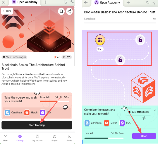 BƯỚC 2. Sau khi vào chương trình mini TG, hãy nhấp vào “Bắt đầu học”, hoàn thành 3 nhiệm vụ khóa học theo hướng dẫn, sau đó nhấp vào “Mở” bên dưới để hoàn thành các nhiệm vụ xã hội theo trình tự.