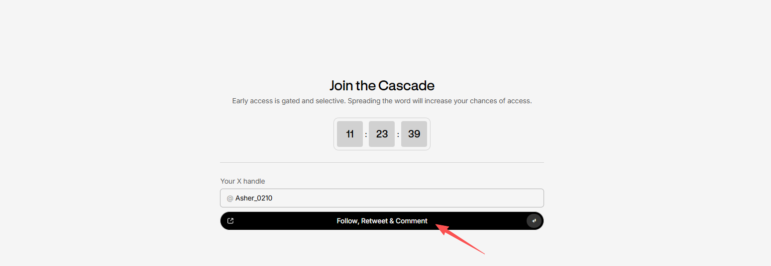 BƯỚC 1. Truy cập trang web chính thức (liên kết: https://cascade.xyz/join ), điền thông tin tài khoản X cá nhân và Gmail của bạn để hoàn tất đăng ký quyền truy cập sớm (nhiệm vụ có thời hạn).