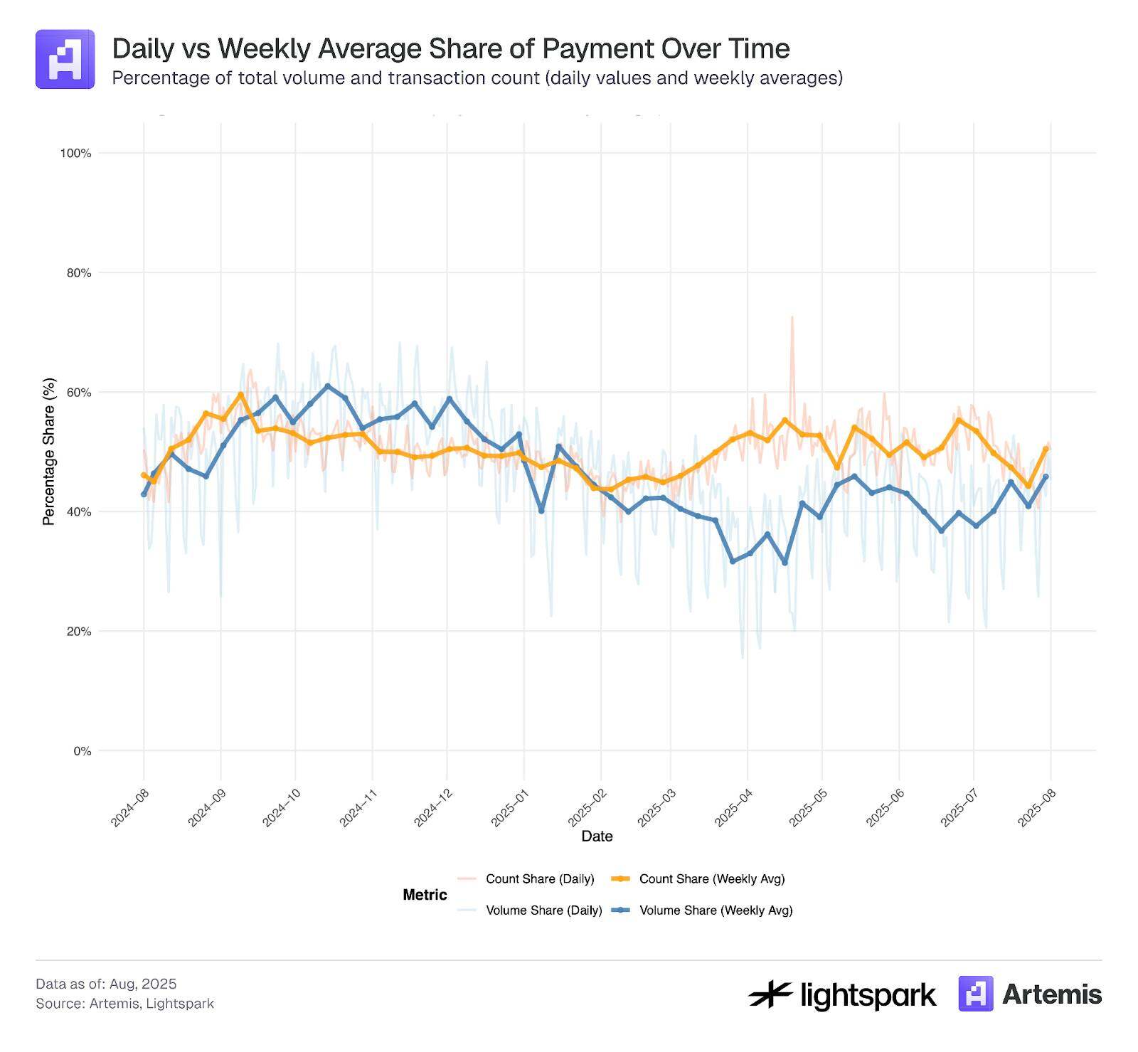 Hình 5 tập trung vào những thay đổi hàng tuần, cho thấy xu hướng áp dụng nhất quán và sự tăng trưởng khối lượng giao dịch hàng tuần trên tất cả các loại hình thanh toán. Bảng 4 tóm tắt thêm những thay đổi tổng thể từ tháng 8 năm 2024 đến tháng 8 năm 2025.