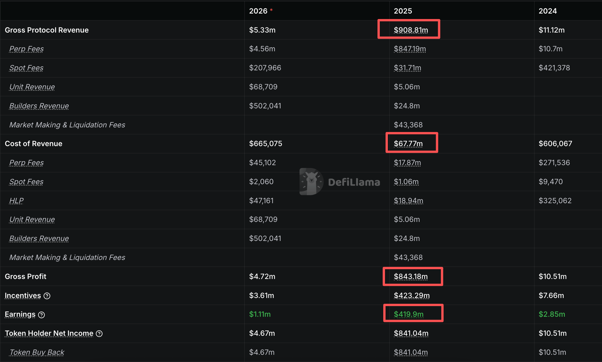 Theo dữ liệu từ DefiLlama, doanh thu năm 2025 của Hyperliquid là 908 triệu USD; chi phí doanh thu khoảng 67.77 triệu USD, lợi nhuận ròng hàng năm khoảng 843 triệu USD, sau khi loại trừ chi phí khuyến khích, lợi nhuận ròng thu về nền tảng năm 2025 lên tới khoảng 420 triệu USD.