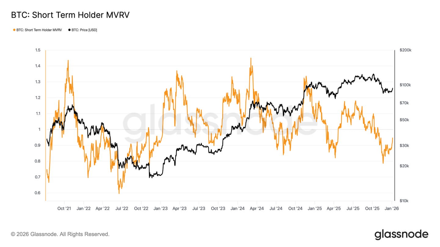 这一动态也清晰地反映在短期持有者 MVRV 指标上。该指标通过比较现货价格与近期买入者的平均成本,反映其持仓盈亏状况。历史上,当该指标持续低于 1(即价格低于平均成本)时,市场往往由空头主导。目前,该指标已从低点 0.79 反弹至 0.95,意味着近期买入者平均仍处于约 5% 的未实现亏损中。若不能尽快重返盈利状态(MVRV > 1),市场仍将面临下行压力,这使得该指标成为未来数周的关键观察点。