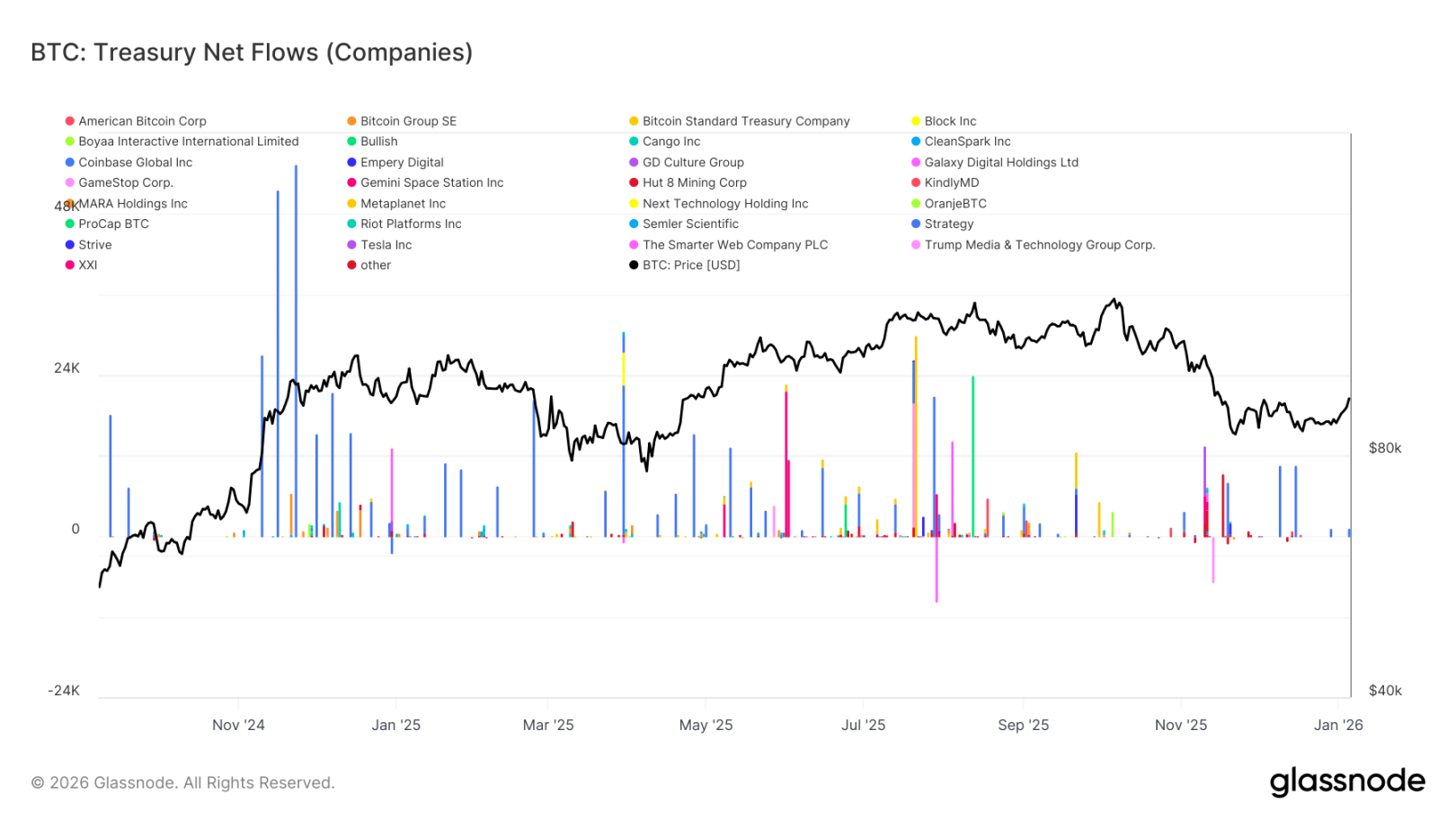 企业资金库仍为比特币提供重要的边际需求支撑,但其买入行为依然呈现间歇性、事件驱动的特征。资金库实体多次出现单周净流入数千枚比特币的情况,但这些买入并未形成持续、稳定的积累模式。