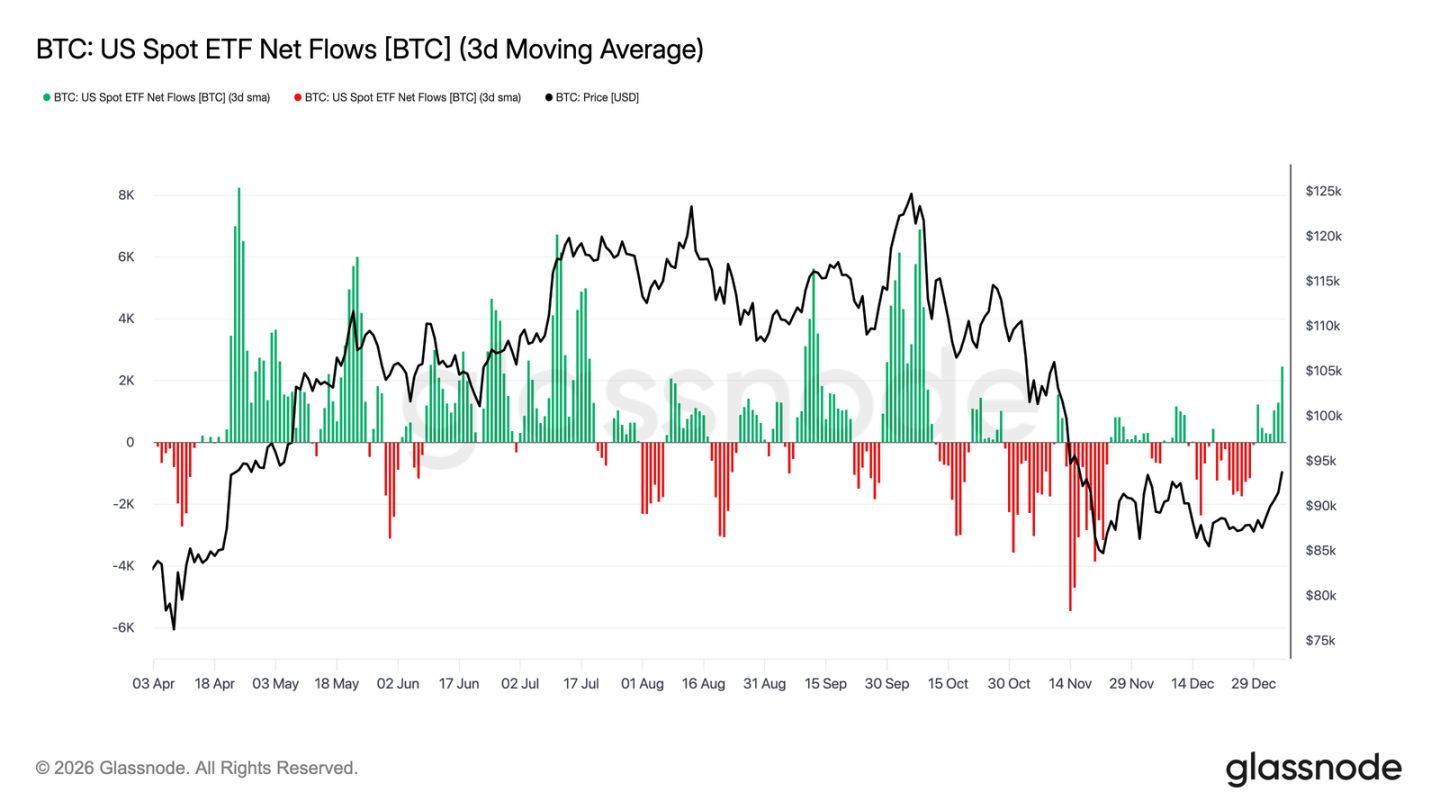 美国现货比特币 ETF 资金流在 2025 年末净流出后,近期重现净流入迹象。与此同时期货市场未平仓合约已停止下滑并开始回升,显示出机构投资者正重新参与市场,衍生品活跃度正在重建。