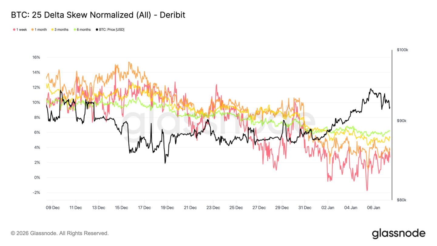 随着隐含波动率企稳,偏斜度为观察交易者的方向性偏好提供了更清晰的视角。过去一个月,各期限看跌期权相对于看涨期权的溢价持续收窄,25-Delta 偏斜度曲线逐步向零轴回归。