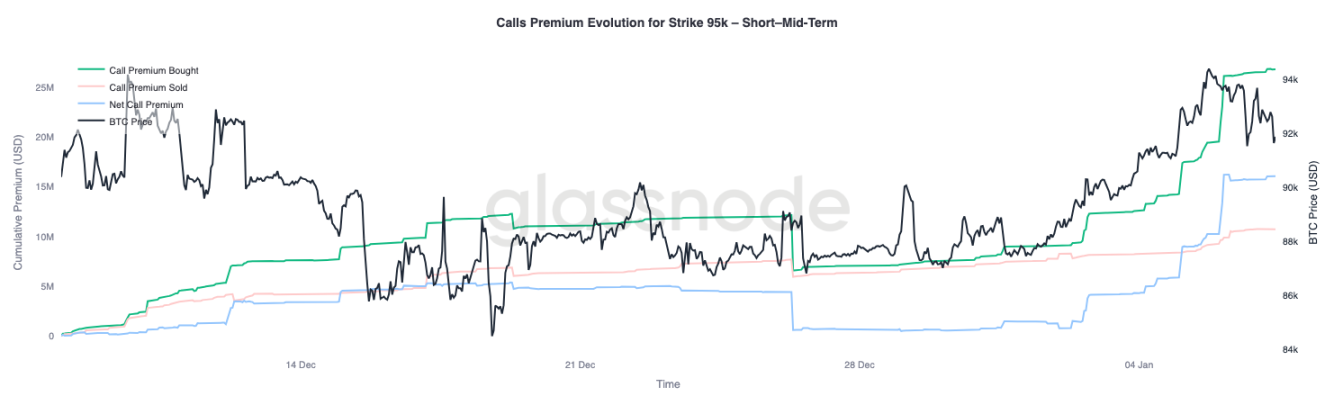 9.5 万美元行权价的看涨期权溢价表现,可作为观察市场情绪变化的有效指标。1 月 1 日当现货价格还在 8.7 万美元附近时,该行权价的看涨期权溢价买入就开始加速,并随着价格向 9.44 万美元的近期高点攀升而持续增加。