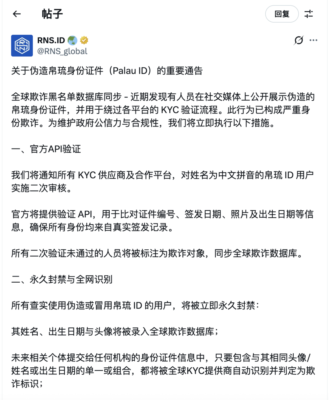 “近期发现有人员在社交媒体上公开展示伪造的帕劳身份证件,并用于绕过各平台的 KYC 验证流程。此行为已构成严重身份欺诈。”RNS.ID 官方宣布,将对所有使用中文拼音的帕劳 ID 用户实施二次审核,未通过验证的用户将被标注为欺诈对象,同步全球欺诈数据库。
