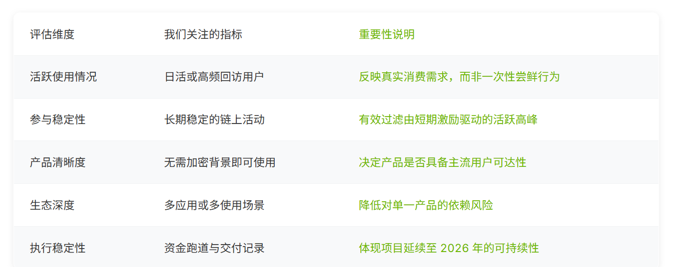 Điều quan trọng không kém là những chỉ số mà bảng xếp hạng này cố tình không đưa vào. Biểu hiện giá token, các chương trình khuyến khích ngắn hạn, lộ trình lớn thiếu xác minh sử dụng, và các dự án chỉ có ý nghĩa hạ tầng nhưng thiếu sức kéo người tiêu dùng, đều không nằm trong phạm vi đánh giá.