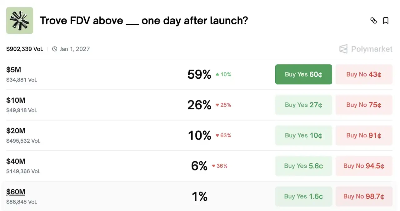 Trove sẽ TGE vào lúc 1 giờ ngày 20 tháng 1 theo giờ Bắc Kinh, dữ liệu thị trường dự đoán trên Polymarket cho thấy, tính theo định giá trước khi bán, token TROVE có 90% khả năng phá giá.