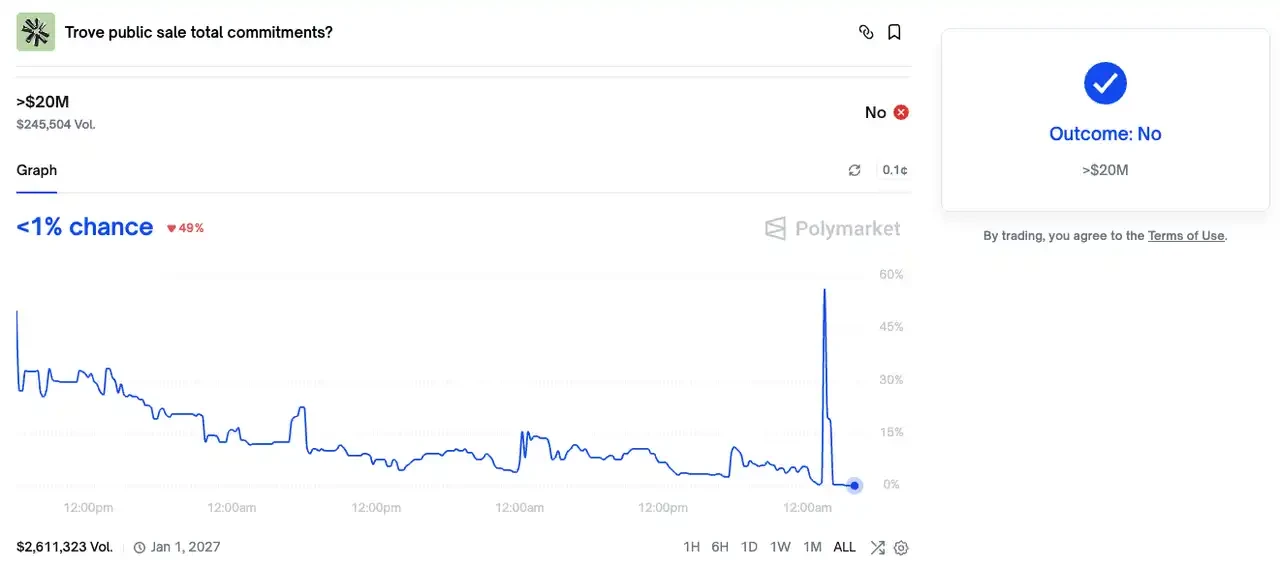 Lúc này, chỉ còn chưa đầy hai giờ nữa là kết thúc ICO, xác suất thị trường dự đoán trên Polymarket về "Tổng số tiền huy động ICO của Trove lớn hơn 20 triệu USD" đã gần như về không.