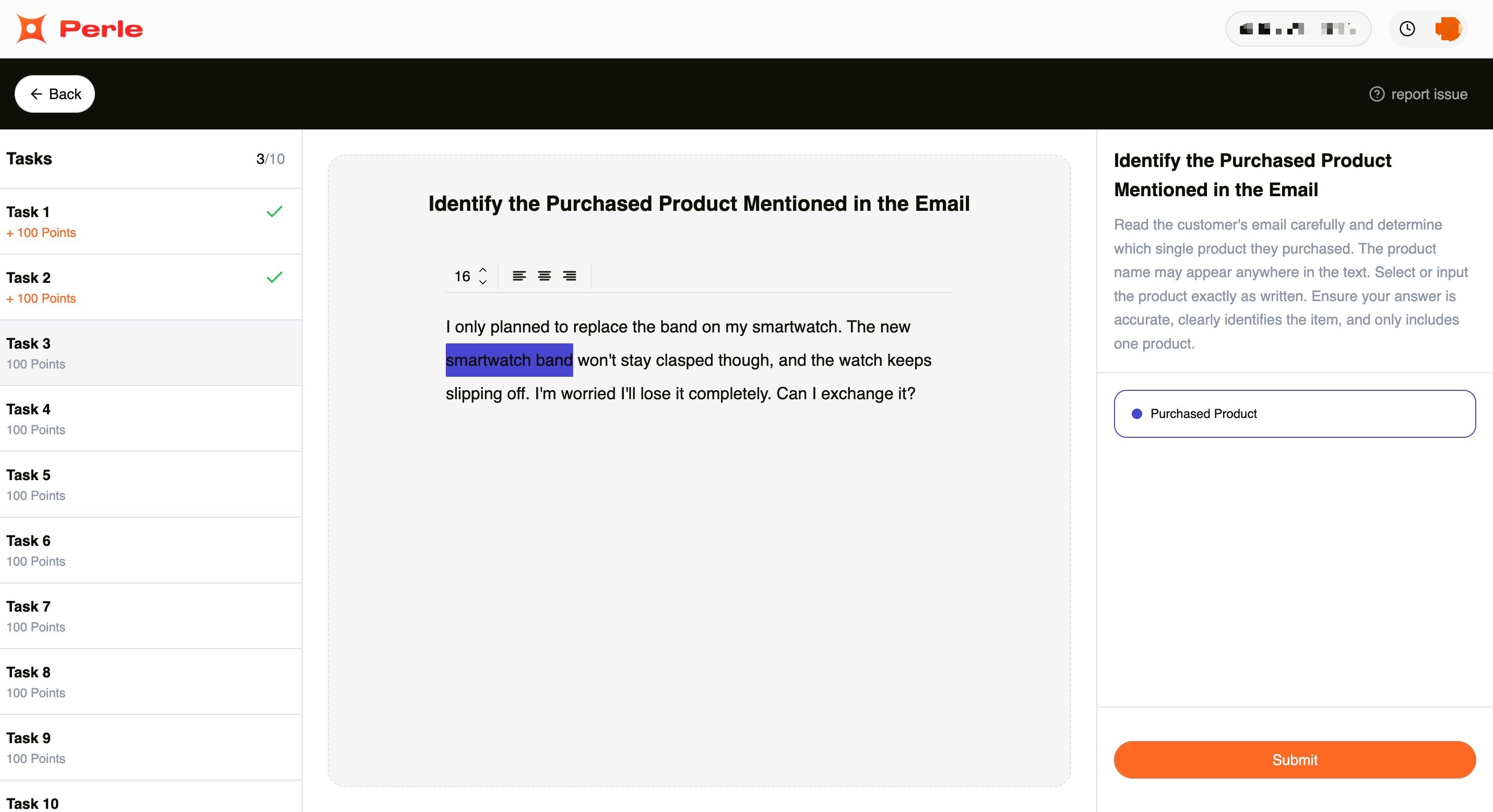 Nhiệm vụ 3. Join The Perle Labs Product Tagging Quest, tìm sản phẩm được đề cập trong thông tin email khiếu nại, tổng cộng 10 câu, mỗi câu 100 điểm, tổng 1000 điểm.