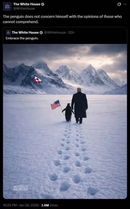 6 giờ sáng hôm qua, tài khoản X của Nhà Trắng đã đăng một bài tweet với nội dung "Embrace the penguin" (Hãy ôm lấy chú chim cánh cụt), kèm theo hình ảnh "Nietzschean Penguin" giơ cao lá cờ Mỹ, cùng với Trump bước về phía những tảng băng trôi xa xôi.