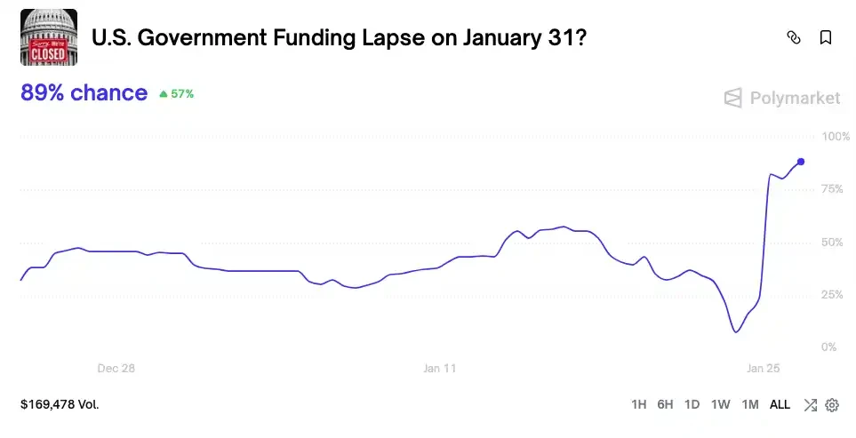 Chính phủ Mỹ lại một lần nữa đứng trước bờ vực đóng cửa. Do một vụ việc nhân viên thực thi pháp luật liên bang bắn chết người một lần nữa xảy ra tại Minnesota, các thượng nghị sĩ Đảng Dân chủ tập thể phản đối dự án phân bổ ngân sách bao gồm kinh phí cho Bộ An ninh Nội địa, dẫn đến rủi ro đóng cửa vào ngày 30 tháng 1 trên Polymarket tăng vọt lên 80%.