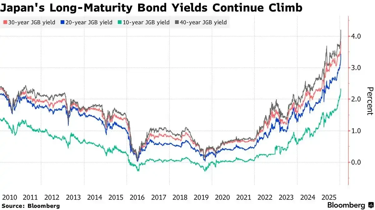 Nhưng bây giờ, Ngân hàng Trung ương Nhật Bản bắt đầu tăng lãi suất (lên 0,75% vào tháng 12 năm 2025), và tân Thủ tướng Sanae Takaichi lại tuyên bố chấm dứt thắt chặt tài khóa, lên kế hoạch đầu tư và giảm thuế quy mô lớn. Điều này đã gây ra mối lo ngại nghiêm trọng trên thị trường về tình hình tài chính của Nhật Bản, dẫn đến việc trái phiếu chính phủ bị bán tháo và lợi suất tăng vọt.