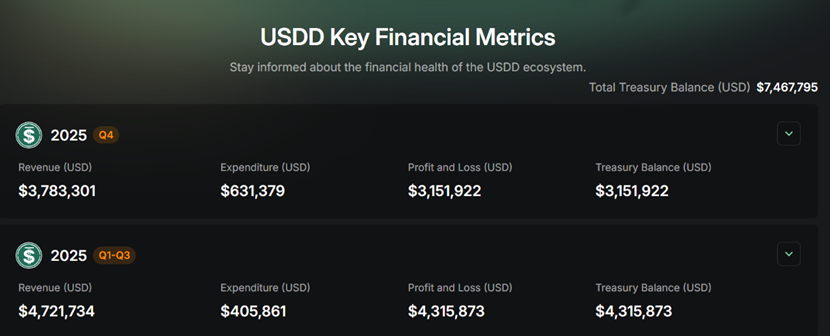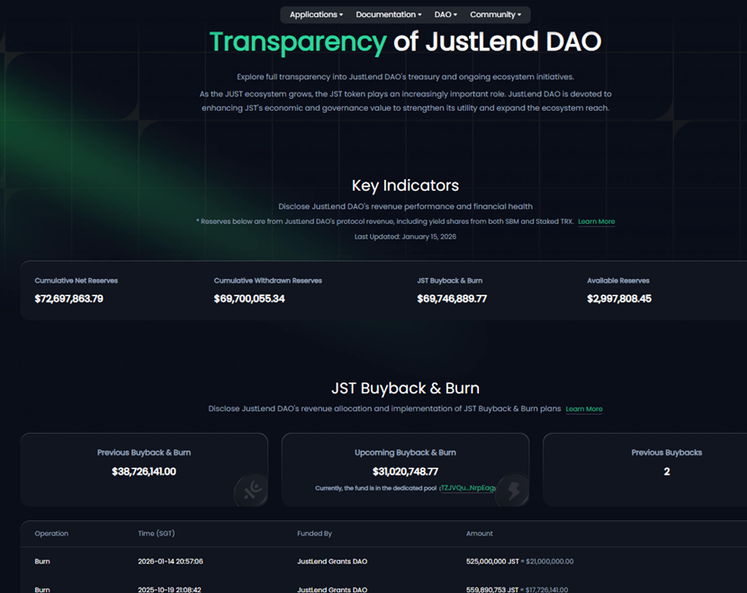 Ngoài ra, ở cấp độ xây dựng tính minh bạch của hệ sinh thái, không chỉ tiết lộ chi tiết tài sản kho bạc dự trữ, liên tục hoàn thiện hệ thống tiết lộ trên chuỗi để người dùng cộng đồng nắm rõ toàn cảnh quỹ kho bạc; đồng thời, cả nền tảng chính thức của JustLend DAO và USDD đều đã chính thức ra mắt trang tiết lộ chuyên biệt "Chỉ số hoạt động tài chính (Transparency)", tập trung hiển thị dữ liệu cốt lõi như dự trữ kho bạc giao thức, số dư quỹ mua lại và đốt JST, số tiền mua lại đã thực thi và toàn bộ hồ sơ giao dịch trên chuỗi, đạt được sự trình bày trực quan hóa một cửa cho dữ liệu hoạt động cốt lõi, hỗ trợ thành viên cộng đồng theo dõi thời gian thực toàn bộ quy trình thực thi động thái tích lũy thu nhập giao thức, phân bổ vốn và mua lại, đốt.
