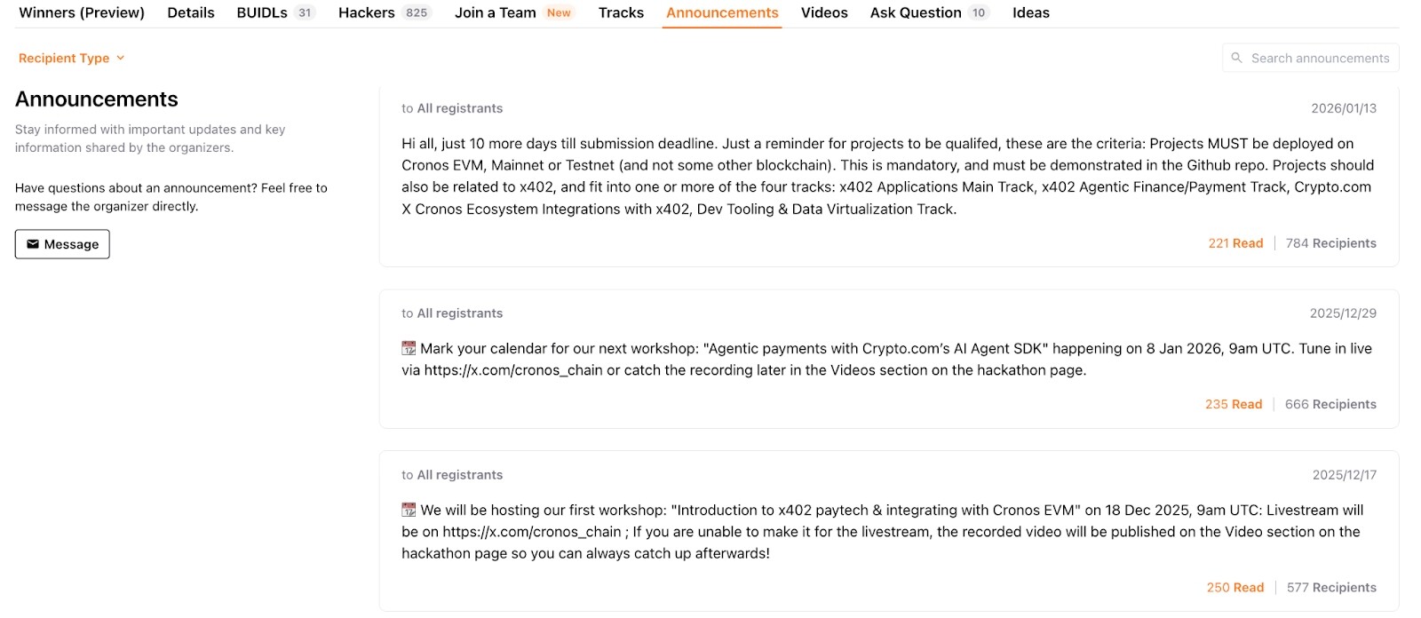 Các nền tảng như DoraHacks có sẵn tính năng giao tiếp, có thể giúp ban tổ chức phát thông báo, để người tham gia nắm bắt động thái bất cứ lúc nào, mà không cần chuyển đổi qua lại giữa nhiều công cụ. Bạn có thể nhắn tin riêng cho người tham gia, gửi tin nhóm cho nhóm đối tượng cụ thể, và còn có thể sử dụng công cụ hỏi đáp AI để tự động xử lý các câu hỏi lặp lại. Tiết kiệm thời gian và công sức.