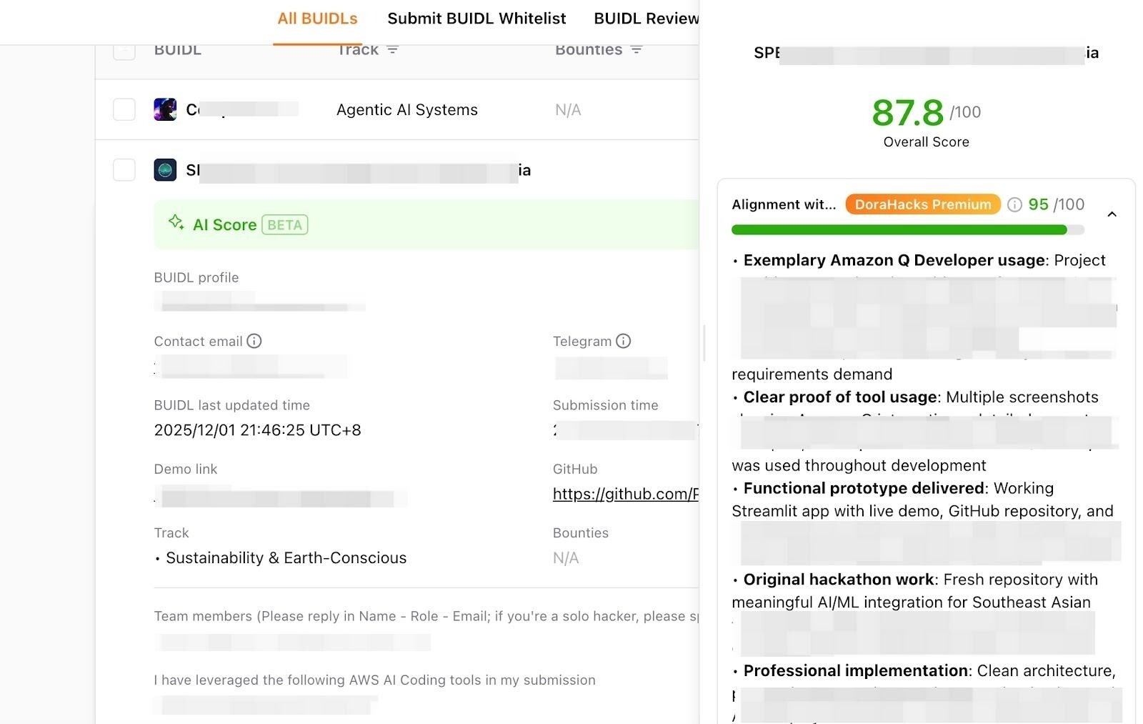 Bảng điều khiển dành cho ban tổ chức của DoraHacks có thể theo dõi tiến độ nộp bài theo thời gian thực, không cần bạn phải làm mới bảng tính thủ công hay đi thúc giục khắp nơi. Quan trọng hơn, hệ thống đánh giá AI của nó có thể ngay lập tức đánh giá các tác phẩm đã nộp (bao gồm kho GitHub và mô tả) và đưa ra phản hồi sâu sắc, giúp bạn tiết kiệm rất nhiều thời gian sàng lọc.