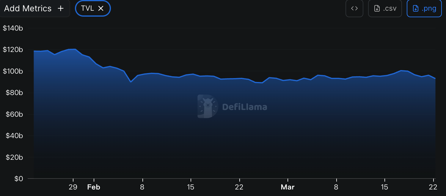 Theo dữ liệu từ DeFiLlama, tổng TVL DeFi tuần này là 92,973 tỷ USD, giảm khoảng 4,0% so với 96,847 tỷ USD của tuần trước.