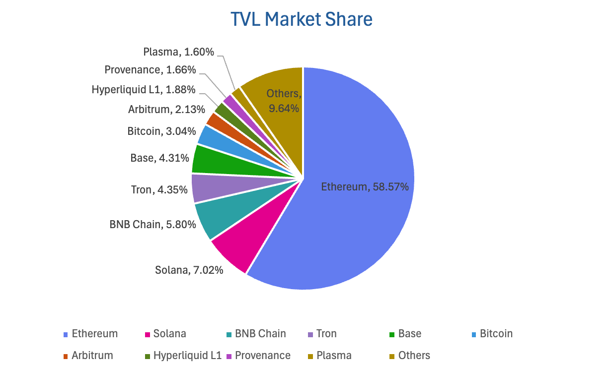 Phân chia theo blockchain, ba blockchain có TVL cao nhất lần lượt là Ethereum, chiếm 58,57%; Solana, chiếm 7,02%; BNB Chain, chiếm 5,80%.