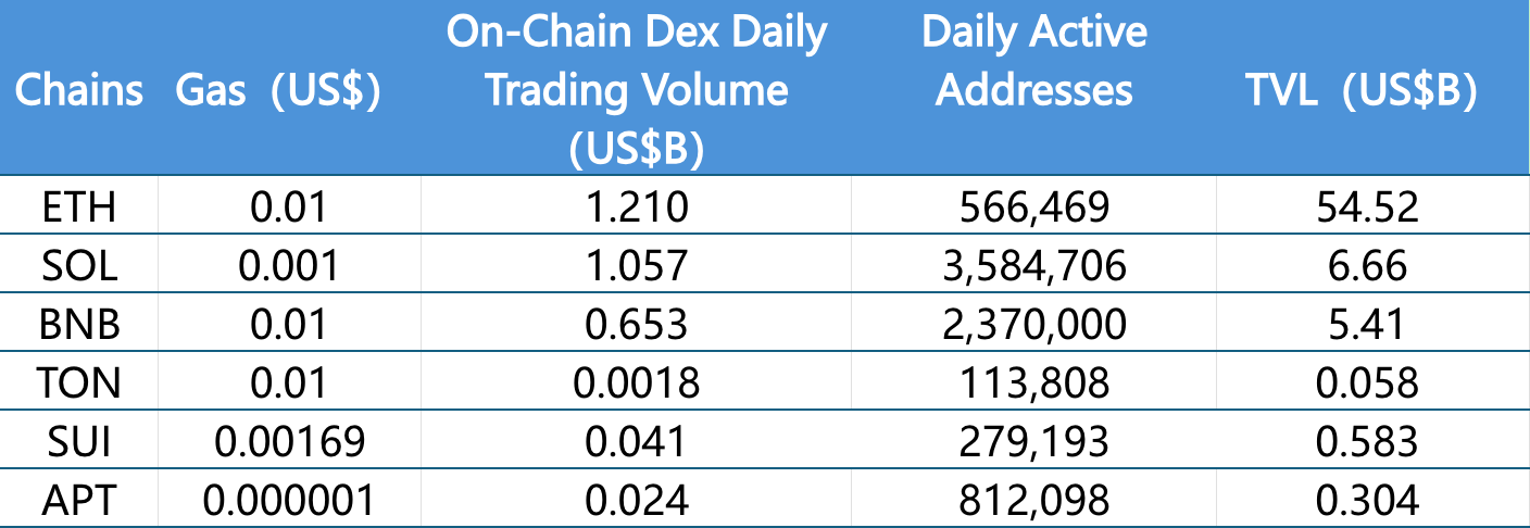 Phân tích dữ liệu liên quan của các Layer 1 chính hiện tại bao gồm ETH, SOL, BNB, TON, SUI và APTOS chủ yếu từ khối lượng giao dịch hàng ngày, địa chỉ hoạt động hàng ngày và phí giao dịch.
