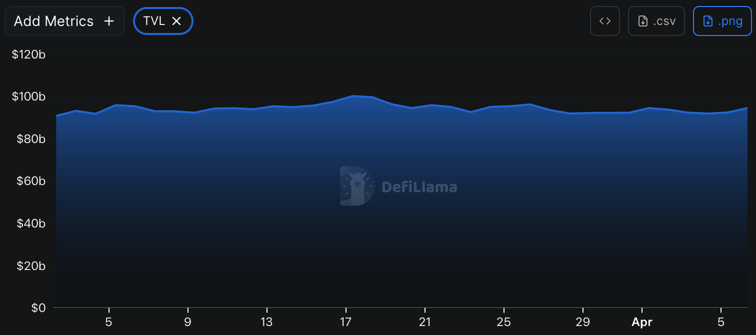 Theo dữ liệu từ DeFiLlama, tổng TVL của DeFi tuần này là 94,524 tỷ USD, tăng khoảng 1,89% so với 92,769 tỷ USD của tuần trước.