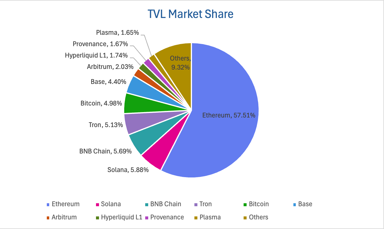 Phân chia theo public chain, ba public chain có TVL cao nhất lần lượt là Ethereum, chiếm 57,03%; Solana, chiếm 6,85%; và BNB Chain, chiếm 5,69%.