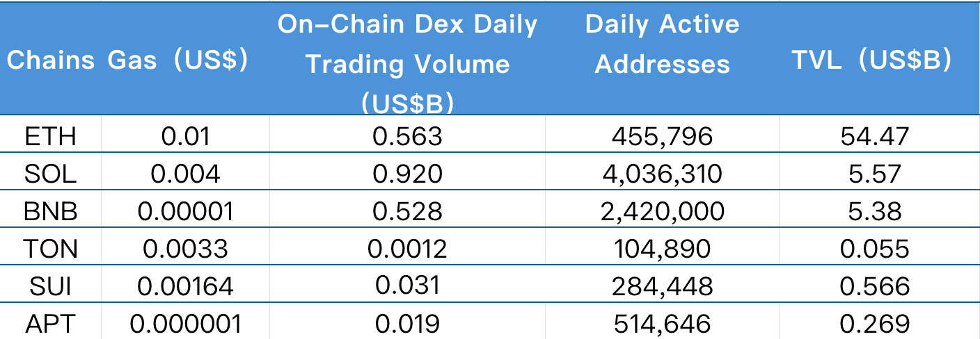 Chủ yếu phân tích dữ liệu liên quan của các Layer 1 chính hiện tại bao gồm ETH, SOL, BNB, TON, SUI và APTOS từ khối lượng giao dịch hàng ngày, địa chỉ hoạt động hàng ngày và phí giao dịch.